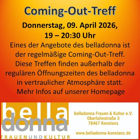 Eines der Angebote des belladonna ist der regelmäßige Coming-Out-Treff. Diese Treffen finden außerhalb der regulären Öffnungszeiten des belladonna in vertraulicher Atmosphäre statt.