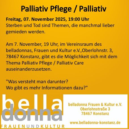 Am 7. November, 19 Uhr, im Vereinsraum des belladonnas, Frauen und Kultur e.V.,Oberlohnstr. 3, 78467 Konstanz, gibt es die Möglichkeit sich mit dem Thema Palliativ Pflege / Palliativ Care auseinanderzusetzen.